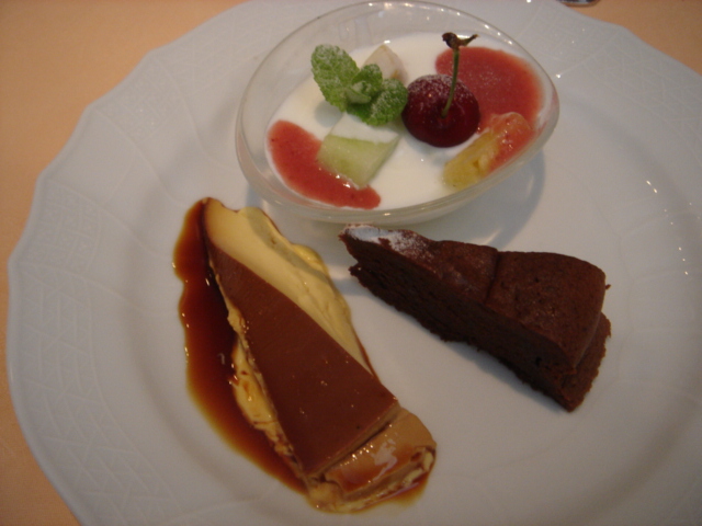プリン、チョコケーキとフルーツ添えヨーグルト