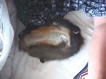 ついに退院できた!3泊の入院生活であった。今日はずいぶん調子もあがってきており、かなり動いていた。また、昨晩、病院の院長先生がご自身で近くの山までドングリの葉を取りに行ってくださったとか、よい病院に巡り会えて本当によかった。ミルクは50cc飲んだそうだし、他の果物や取ってきていただいた葉っぱも食べている。また、連れ帰ってからもミカンやヒマワリの種を口にしている。何より嬉しいのは、調子が悪くなってから初めて声を聞けたことだ。いつも人の姿を見るとブーブー鳴きながら出してくれと寄ってくるのだが、具合が悪くなってからはそれがなかった。病院へ会いに行ったときも一度も鳴かなかった。しかし、家へ連れてきてゆっくりあたりを見回し落ち着いたところで初めて声を出した。それでなでてやるとだんだん分かってきたらしく、ブーブーと出してくれコールである。そこで、少しだけだよと言い聞かせつつ出してやると、私の肩に飛び乗ったあと、自分のお気に入りの場所に行った。しかし、今日はゆっくり寝かせたかったので排泄だけさせて、すぐに小さめのカゴに入れ、タオルをかけ、ヒヨコ電球で保温しながらそのまま置いておく。あと1週間ぐらい はあまりあばれさせずにゆっくり寝かせたかったので排泄だけさせて、すぐに小さめのカゴに入れ、タオルをかけ、ヒヨコ電球で保温しながらそのまま置いておく。あと1週間ぐらいはあまりあばれさせずにゆっくり養生させたい。原因は結局分からなかったが、いままで使っていたカゴは念のため熱湯消毒し、日に当てた。いずれにせよもう2〜3日は暴れさせないために小さいカゴに入れておくつもりである。 |