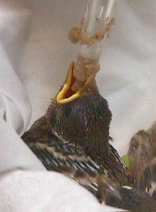 | 里親ボランティアを始めて3年目にしてはじめて、ごく一般的なスズメを手がけることになった。赤裸ではないが、まだ羽軸がツンツン残っている。初心者にはちょうど育てごろ。 わが家の鳥の名前はすべてお菓子にちなむことになっている。足輪の色がピンクと緑だったので、即決。「桜餅のさくら」と「ちまき」。 |