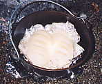 4.ボールに入れぬるま湯に浸したふきんを固く絞り 乾燥しないように丸く形を整えた生地の上にかぶせ 1次醗酵をする。野外だと気温が低いので焚き火から離して 暖かいところでやるとうまくいく。 |