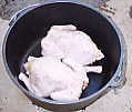 5.温めておいたDOに鶏を入れる。蓋をしておきの上に置く。 はじめの1時間は下からのみの加熱。じっくりと鶏を蒸す感じで あまり火を強くしないように。ブリケッツを使う人は10個以下。 |