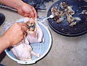 4.火からおろし3で出来た物を鶏のお腹に肛門からパンパンになるまで詰め込む 肛門の開いてる部分を楊枝で縫うように閉じる。 |