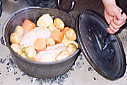 6.1時間たったところで4つぐらいに切った人参、丸のジャガイモ、 4つぐらいに切ったコーンを鶏の周りにぎっしりと置く。 蓋をして今度はDOの上からも加熱する。蓋の上におきをのせる。 木炭の場合結構多めにのせたほうがいいと思う。 ブリケッツの場合は15から20個ぐらい。 |