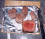 3.茹で上がったら別鍋に煮汁全部を移す。 タンはまな板で2〜3pぐらいに切る。 軽く塩コショウしておきましょう。 この時は残ったロースとビーフを角切りにしていっしょに 入れてみました。 |
