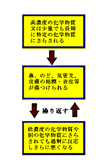 化学物質に暴露されて一旦過敏症を獲得すると、その後は極めて微量の同系統の化学物質で種々の臨床症状が発症してくる状態のことを ”化学物質過敏症(Chemical Sensitivity,CS)あるいは多発性(複合)化学物質過敏症(Multiple Chemical Sensitivity,MCS)といいます。このことから 「シックハウス症候群」 は 「化学物質過敏症」 の1つで家の室内空気中の化学物質が原因となったものであるといえます。