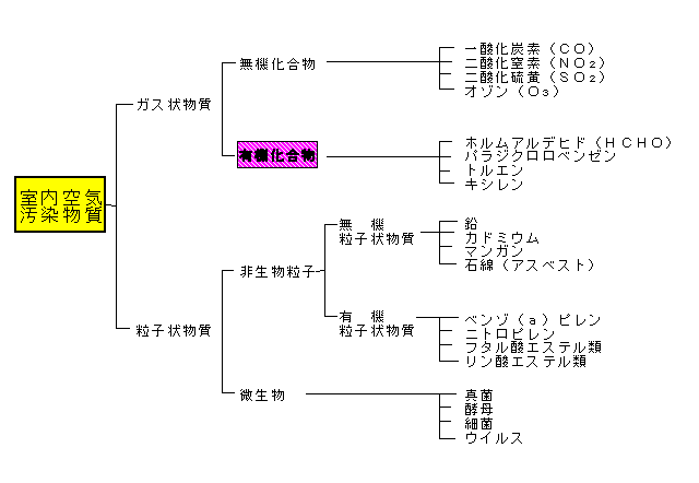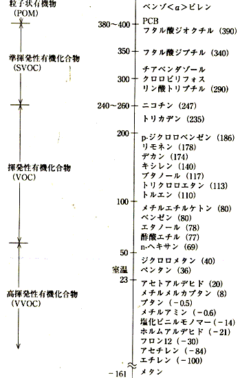 揮発性有機化合物(VOC)とは、空気中に揮発する有機化合物全体を指すもので、シックビルディング症候群の主な要因として、ビルや住宅に於いて特に注目されている物質で、実際、室内の空気中には極めて多くの種類のVOCが存在することが確認されています。その中には、発ガン性を疑われている物質もあります。そして、VOCは総称であってこれでは範囲が広すぎて漠然とし過ぎているためWHOでは室内空気汚染の観点から、右の表のように有機化合物の沸点をもとにVOCを高揮発性有機化合物(VeryVolatile Organic Compounds,VVOC:沸点が50℃以下のもの)、揮発性有機化合物(VOC:沸点が50〜260℃のもの)、準揮発性有機化合物(SemiVolatile Organic Compounds,SVOC:沸点が260〜400℃のもの),粒子状物質(Paraticulate Organic Matter,POM:沸点が380℃以上のもの)の4種類に分類しています。
