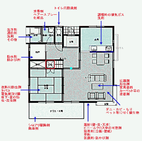 CSがSBS問題(換気、新建材)と違うところは、居住者の体質・生活様式が大きく影響してくることで、症状の出現は自律神経系を中心に様々ですが、主に患者側の要因で決まり、原因物質によって一定の症状が出てくる訳でない点が、従来の中毒症状と大きく異なる点です。そして、過敏症にかかりやすいと考えられるのは、小児、更年期の女性、免疫力の低下した老人があげられます。