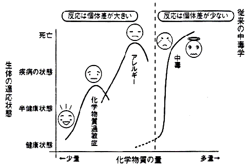 <化学物質の量と健康度(あなたも化学物質過敏症?、農文協)> |