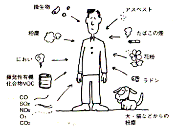 空気中には、右の図で示されるように、人の健康や物の品質に影響を与えるものとして、ホルムアルデヒドや揮発性有機化合物等のガス状の汚染物質、粉塵やタバコの煙、花粉といった粒子状の汚染物質、また、細菌や真菌などの微生物等が存在しています。そして、これらによってアレルギーやMCS(化学物質過敏症)と呼ばれる症状が引き起こされるのですが、こうした物質によってMCSが発症しやすい環境の家をシックハウスと呼んでいるのです。なぜ日本の一般の家でシックハウスが問題となるかというと、日本では