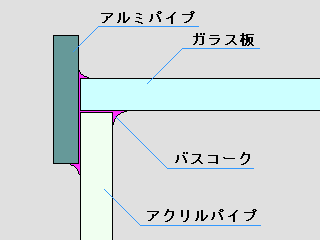 さて、いよいよ最後の行程です。 鏡筒にガラスを取り付けましょう。 取り付け方は図の通りです。(^_^; アクリルパイプとガラスの間にもシリコンボンド(バスコーク)を塗って下さいね。 |