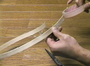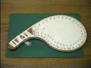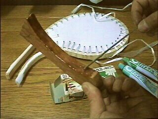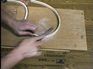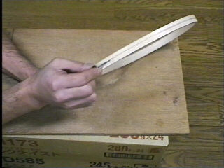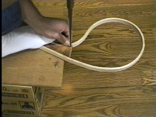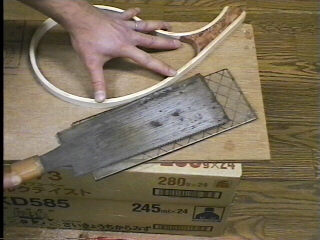 作業に取りかかる前に、まず檜材を、お風呂等に一晩つけておきます。 十分柔らかくなったら引き上げて、余分な水分をふき取り、作業に取りかかります。 ひもを使って、枠に檜材を曲げながら固定します。 この状態で、2〜3日間乾燥させます。 |