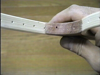 さて、ここが一番難しいところ! 溝切りをします。 適当な高さの台になるものに、鋸を押し当てるようにして切ります。 深さは1.5〜2mm、幅2〜2.5mm位がよいでしょう。 小さな(−)ドライバーをヤスリで削って作った 「のみ」で仕上げます。 |