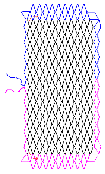 1周40目として、編み方を説明します。 まず、底の部分は「A」から編み始めて「B」まで 10目X18段(9目)作ります。 おっと、ここで編み始めの部分に、糸の全体の長さの 約半分ほどを確保しておいてくださいね。 18段目が終わったら(「B」の所)、そのまま19段目に 折り返し(矢印)はじっこまで行ったら三角目を作って側面の 半分まで編み、戻ってきます。(ピンクの部分) で、さっきの19段目の折り返した部分まで戻ってきたら ここで三角目を作って反対側の側面の半分を編みます。 こうやって、網の半分だけを先に編んでしまい、残りの半分は「A」の所に残しておいた 糸を使って編んでいきます。(青い部分) こうすると、底の部分につなぎ目を作らずに編むことが出来ます。(^o^)v |