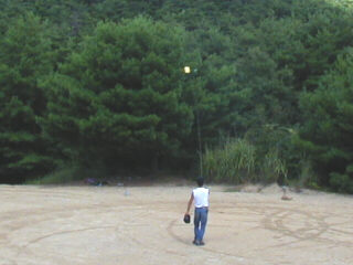 昔バイクで走り回っていたこの空き地は、もっと広く感じていたんだけど、ワイヤーをセットしたら、 どこにもぶつけずに飛ばすことが出来るのは一カ所だけ。それも1mもずれるとアウト。(^_^;