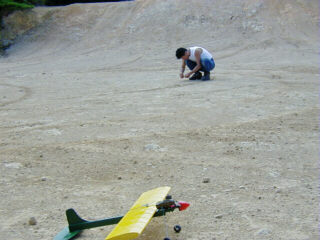 木にぶつからないように気を付けながら徐々に高度を下げようとしたら、木と反対方向にある 土の斜面(上の写真参照)に主翼が接触・・・(>_<)