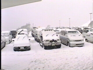 右の写真は、お昼頃の駐車場でのカットです。 明け方降り始めた雪で、車は真っ白です。 |