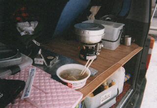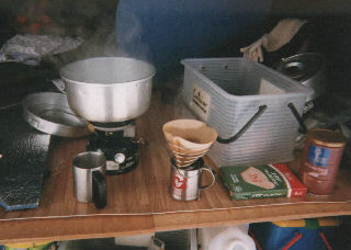 食後のコーヒーははずせません。(^o^; ぼちぼち滑りに行こうと用意を始めたら、雪が降り始めました。 今回もビデオ撮りができない。(T_T) でも、こんなこともあろうかと、「撮りっきりコニカ 超〜mini」を用意してきました。 |