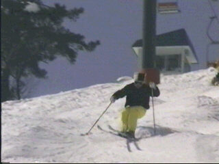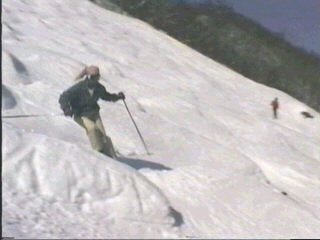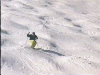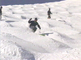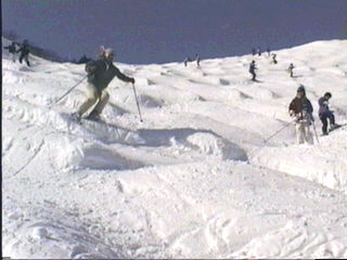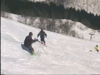 よこちゃんの滑りです。 この日のアルペンコースはコブの向こう(谷)側が切り立っている上に、 とても堅かったので、滑りにくかったです。 |