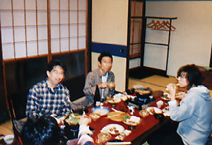 温泉から上がり、待望の猪鍋を食べる。「いただきまーす!」