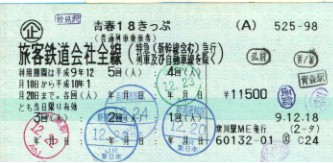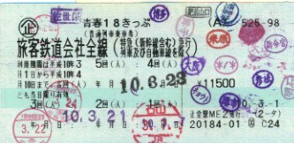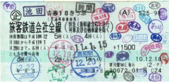 | 下車印は 豊橋 宝塚 桜島 京都 奈良 新大阪 西九条 和田山 関西空港 住吉 鳳 八鹿 城崎 東羽衣 和歌山 白河 越後川口 名古屋 十日町 上菅谷 五条 戸狩野沢温泉 黒磯 小出 松本 大阪 宇都宮 福島 会津若松 水戸 伊賀上野 名古屋 長野 寒川 郡山 安積永盛 木津 |