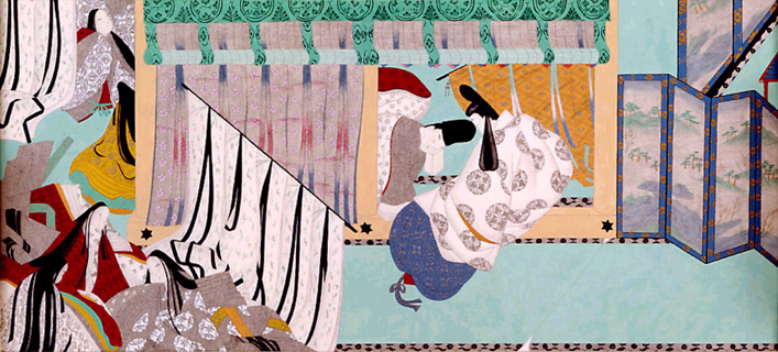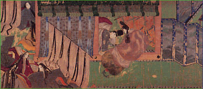 木版本「源氏物語絵巻」より、「柏木(二)」。源氏の怒りに触れた柏木の病状は、一層重くなります。画面中央に横たわっているのが柏木。源氏の息子であり柏木の親友である夕霧(画面で背を向けている人物)が病床を見舞うが、柏木は間もなく息をひきとります。御簾の左側では女房たちが悲しんでいます。