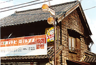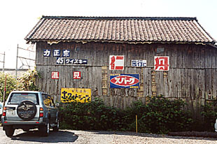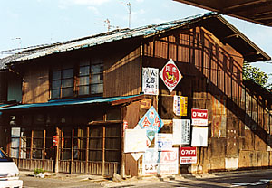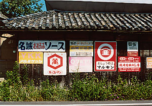 (左)ホーロー製の看板とスチール板の看板が貼られています。
