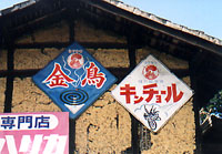 金鳥<撮影日> (上)1998年11月 (下)1998年12月 <撮影場所> (上)神奈川県川崎市麻生区 (下)東京都青梅市 お馴染みのホーロー看板です。 この看板を見たことがない人は少ないのでは ないでしょうか? たいていは、「キンチョール」(下欄参照)と一緒に 対で貼られています。 上下の大きな違いは、「かとりせんこう」の文字と 煙の有無で、上の方が古いと思われますが(?)。 | |
