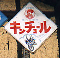 キンチョール<撮影日> (上)1989年5月 (下)1998年12月 <撮影場所> (上)山口県萩市 (下)東京都青梅市 上の「金鳥」と一緒に貼られている場合が多いです。 これも上下でデザインが微妙に違っています。 こちらも上の方が古いと思われますが どうでしょうか? | |