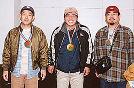 わんこそば大会 男性の部の優勝(金)は伊藤さん、準優勝(銀)は遠藤さん、3位(銅)は山村さんでした。