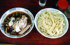 | 代々木上原の大勝軒から暖簾分けした「丸長グループ」の 一軒。 自家製の手打ち麺はかなり太く、量も多い。 スープはやや薄味だが、化学調味料を使っていないので、 ダシのうまみがあり、何度も食べるとやみつきになる。 具で特にうまいのが、自家製チャーシュー! チャーシューだけを買い求める客もいるそうだ。 メニューでは、「もりそば」というつけ麺スタイルのラーメンが 一番人気。 | |