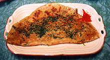 | お好み焼きに近いものだが、もっと薄っぺらくて、 具はほとんど入っていない。 ねぎと桜えびが少々入っていた。 クレープのようなわりとしっかりとした生地である。 | |