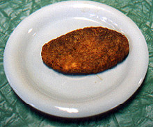 | 上の「かどや」のふらいよりもソースがたっぷりと ついている。店は駄菓子屋さんと兼ねており、 まさに子供向けのおやつなのである。 | |