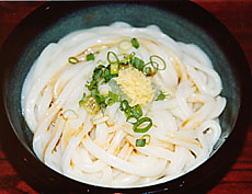 | 「しょうゆうどん」とは、あつあつの釜揚げしたうどんに 生醤油と薬味(ねぎとしょうが)を少々かけただけの シンプルな食べ方だが、うどんの旨さがとてもよくわかる さぬきうどんならではの食べ方。 | |