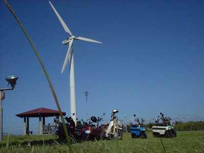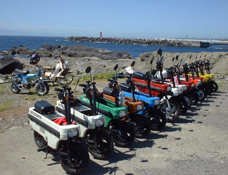 たいへん長らくお待たせしました:(*^^*)ゞ やっと、7月31日に開催した『みんなでモトコツーリング in三浦半島のツーリングレポートを 作成しましたので、よかったら読んでみてくださいね(^o^) このごろ毎日暑い日が続いています。 きょうも朝から、カラっと晴れました(^o^) この分だと、お昼過ぎには連日のように35度前後まで行ってしまうかもしれません(^^;) 一応、モトコのオーバーヒート対策としてシリンダヘッドの放熱フィンをアルミ板で拡張してみました(^-^) ぼくのほうも、SPF130というかなりの遮光値の日焼け止めを塗って出発です(^-^) 今回のコースは川崎から国道一号線を通って横浜まで出て、そこから国道16号線を通って横須賀市まで行って そこから国道134号線で三浦海岸まで行く予定です(^o^) 第一回の鎌倉ツーリングよりは距離が長めで、番外編の丹沢湖ツーリングよりは短めのコースです(^o^) まずは、第一集合場所の川崎市幸区の幸警察署前の公園に出かけました(^-^) 集合時間の1時間前の午前8時過ぎには到着(^o^) モトコの調子もまあまあのようです(^-^) このごろ2段変速機の2段目のクラッチシューが磨り減ってきたようで、1速から2速への変速タイミングが 40〜45km/hぐらいに上がってきています;(=^^=); 坂道などでは1速で引っ張れるのでありがたいんですが、平地を走っているともうちょっと早く2速に入って 欲しい気がします;(=^^=); エンジン全体のセッティングも、空気の濃い冬場に比べると調子はいま一つですが、まあこんなものでしょう(^-^) 今日の装備は、ディジタルカメラとGPS腕時計、簡単な工具とパンク修理剤です(^-^) ヘルメットはオープンエアーを楽しむために、半キャップにしてみました(^o^) 集合時間は9時なので、まだどなたもいらっしゃっていません。 公園のベンチに座って待っていると、朝の散歩の途中らしいおじさんが話しかけていらっしゃいました(^o^) こんな小さいバイクは初めて見たってことで、やっぱりモトコはどこに行っても人目を惹きますねー:(*^^*); そうしている内に、TAKUMIさんとigaさんとふじわらさんが到着されました(^o^) 3台のモトコンポは、、緑、サファリブラウン、青のオリジナルカラーに塗り直されています(^o^) ご挨拶やモトコ話をしているうちに、みなさん続々と集まられてきて、あっと言う間に11台のモトコと ゴリラと刀1100が揃いました(^o^) 参加者のみなさんは、ふるさわさん、たしろさん、igaさん、ふじわらさん、TAKUMIさん、 MAWさん、わたなべさん、ふくださん、一三六さん、いしかわさん、かしわぎさん、ドラちゃんさんで、 かしわぎさんは刀1100でお見送りに来て下さって、ドラちゃんさんもゴリラで途中までお見送りに 来て下さいました:(*^^*); 集まったモトコはほとんどがエンジン廻りがノーマルですが、わたなべさんのモトコはアクシスモトコで、 みるからにパワーがあって速そうです(^o^) そうそうっ、戦隊もののゴレンジャーと同じ、赤、青、緑、黄、桃(さくら色)の五色のモトコも 揃いました(笑)(^o^) みんなで、輪になって端から次々に自己紹介をしたあとに、いよいよ出発です(^o^) お見送りに来て下さったかしわぎさん、ありがとうございました!(^o^) ここで、いきなり最初のトラブル発生です;(=^^=); ふくださんのモトコのリアタイヤが、どうやらパンクのようでペチャンコになっちゃっています;(=^^=); タイヤの外周を調べてみたところ、それらしいものは刺さっていないですし、虫もちゃんと入っている ようだったんですが、とりあえずパンク修理剤を注入して様子を見ながら出発することにしました;(-^^-)ゞ まずは、公園を出てすぐのところにあるガソリンスタンドで給油です。 そのあと、国道一号線の端っこをゴリラとモトコ11台とでトコトコ走り始めました(^o^) さすがにこれだけのモトコが集まって走っていると目立ちますねー!:(*^^*); 追い抜いていく車のかたや、歩行者のかた、他のライダーのかたがたが注目していらっしゃるのが わかります:(*^^*); このごろはこれが快感になってきています〜(笑):(*^^*)ゞ 横浜のちょっと手前でドラちゃんさんとはお別れになり、その後はモトコだけで先を進むことになります。 ドラちゃんさん、わざわざありがとうございました!:(*^^*); 道中は順調に進み、横浜を通過して道は国道16号線に入りました。 それにしてもまだ午前中だというのに暑いです〜(^^;) 走っていればまだマシなんですが、 信号で停まるとキツイです〜;(=^^=); 途中で、ふくださんのモトコのタイヤがまた萎んできたので、コンビニで休憩することに(^-^) さらにパンク修理剤を充填して様子をみます(^-^) どこからも液が噴き出してきている感じがないので たぶんだいじょうぶだとは思うんですがちょっと心配です;(=^^=); コンビニでは、みなさん水分補給をしてとりあえず生き返って出発です(^o^) 道もだんだんと細くなってきて、片側1車線になってしまい、モトコでは交通のジャマにならないように 走るのが辛くなってきました;(-^^-)ゞ とにかく目一杯
