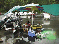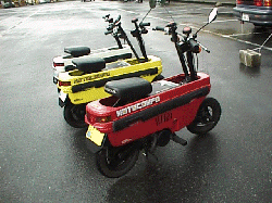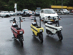 8月2日(日)、Hisa−CさんのHPでモトコンポOFF会in秋吉台が開催され、 ぼくも参加しました(^o^) 当日の模様を簡単ですがご報告します(^o^) 前日の午後3時ごろに川崎を車で出発して、東名、名神、中国と高速道路を走り続けて 秋吉台に着いたのは当日の夜中の1時半くらいでした;(=^^=)ゞ あまりに順調に早く着きすぎてしまったので、どうしようかと迷ったあげくに一度大正洞の 駐車場までいってみたんですが、かなりの数の車が集まって峠道をカっ飛んでいたので 一度高速のIC近くのコンビニに戻って朝まで仮眠しました(^o^) 明るくなってから大正洞の駐車場に移動し、モトコンポを車外に出してまた仮眠を続けていると あっというまに午前11時の集合時間になりました(^o^) 時間ピッタリにHisa−Cさんが愛車REX君に乗って登場されました(^o^) モトコンポのJr.00もREX君の後部座席に乗ってきています(^o^) Jr.00を見せていただいている内に、田澤さんが到着されました(^o^) 用意してきたテーブルや椅子を駐車場の片隅に並べて、モトコンポの話題で 大いに盛り上がりました:(*^^*); ちょっと調子がよくないということだったHisa−CさんのJr.00を いじらせていただいたりと、楽しい時間を過ごせました(^o^) 何といっても特筆すべきは当日のお天気です;(-^^-); バケツをひっくり返したような大雨が降ったかと思ったら、すぐにすごい日差しが照りつける 快晴になり、しばらくするとまた大雨になるというパターンを何度も繰り返しました;(-^^-); 田澤さんが持ってきてくださったタープのおかげで、なんとかOFF会を続けることが できましたが、それにしても大雨の中、駐車場にタープを張って楽しそうに盛り上がって いたぼくたちは、他から見るとちょっと奇特に写っていたかもしれないです〜(笑);(=^^=)ゞ お昼は田澤さんの持ってきていただいたお弁当を御馳走になって(すごくおいしかったです!) 午後になってもずっとOFF会は続き、気が付いたら4時半を回っていました;(-^^-)ゞ Hisa−Cさん、田澤さん、とっても楽しかったです:(*^^*); ほんとうにありがとうございました!!:(*^^*); |