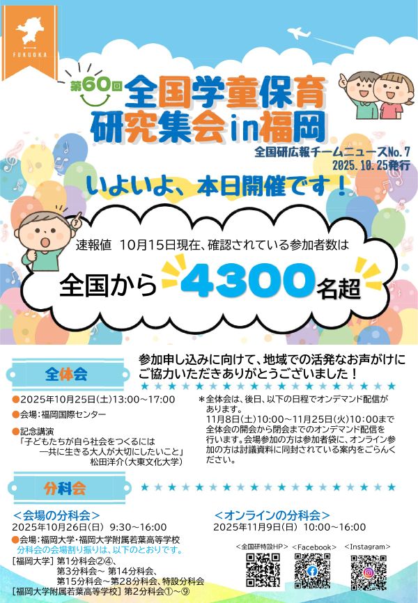 - 第60回全国学童保育研究集会の参加申し込みの受付を開始しました。申し込み締め切りは9月25日(木)【オンライン参加のみの場合】/ 10月8日(水)【会場参加の場合】です。早めのお申し込みをお願いします。