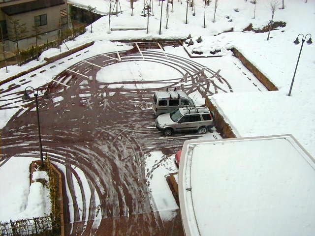 玄関前に自動車の轍の描いた軌跡 (66kB)