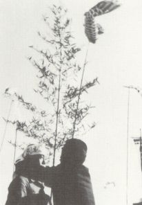 壮途を祝す鯉のぼりの下で鉢巻きを受ける岡山少尉
