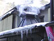 湯舟はそれほど大きくはない。大人5人も入るとちょっとうるさく感じる。この手の施設はそれなりに人が入るので、ゆったりとつかるのは難しいだろう。しかし大きな窓からは雪景色、浴室いっぱいに壁や天井に使っている白木が香る。空いてりゃ悪くはないのだが‥‥。湯は一日一回取り替えると書いてある‥‥ってことは循環? でもまだ書いてあるだけ正直。最近じゃ偽装してまで、かけ流しに見せ掛ける偽物もあるのだから。