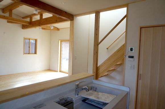 | 対面キッチンからダイニング。化粧梁がアクセントに!壁や天井は珪藻土壁紙で仕上げた自然素材の家 埼玉県さいたま市 H様邸リノベーション事例写真 |