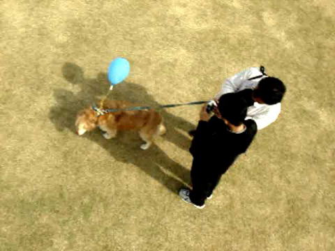 公園で、犬の散歩中の2人です。凧のイベントでの風景です。写した写真の確認中のようです。