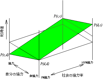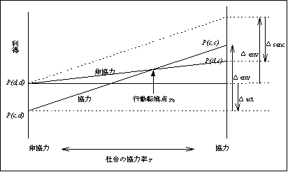 このモデルでは利得行列にねじれが生じる場合があり、ある「社会の協力率」を境に合理的行動が変わる「行動転換点」が生まれる。この時の協力率は