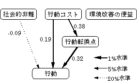 仮定した合理的行動モデルが実際の行動に当てはまるのかを検討した結果(図3)、「行動コスト」が「行動」に影響を与えていること、および「環境改善の便益」が「行動」に影響を与えていないことが確かめられた。しかし、行動転換点を通じて行動が導かれるとしたモデルとは異なり、各要素が直接行動と結びつく傾向にあった。