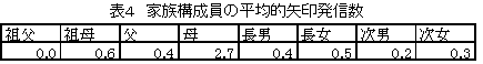 家族の構成員ごとに、誰から誰に話をしているのかを表5に整理した。値としては、単なる矢印を1、○が付けられた矢印を2として重み付けで点数評価を行っている。発信者、受信者がそれぞれ存在する家庭に於いて、重み付き矢印の平均をとっている。たとえば発信者が母、受信者が祖父の場合には0.64となっているが、これは祖父と母がいっしょにいる家庭に於いて(もしすべてが○なしの矢印であった場合には)2世帯に1世帯以上は母から祖父への話がなされることを意味している。