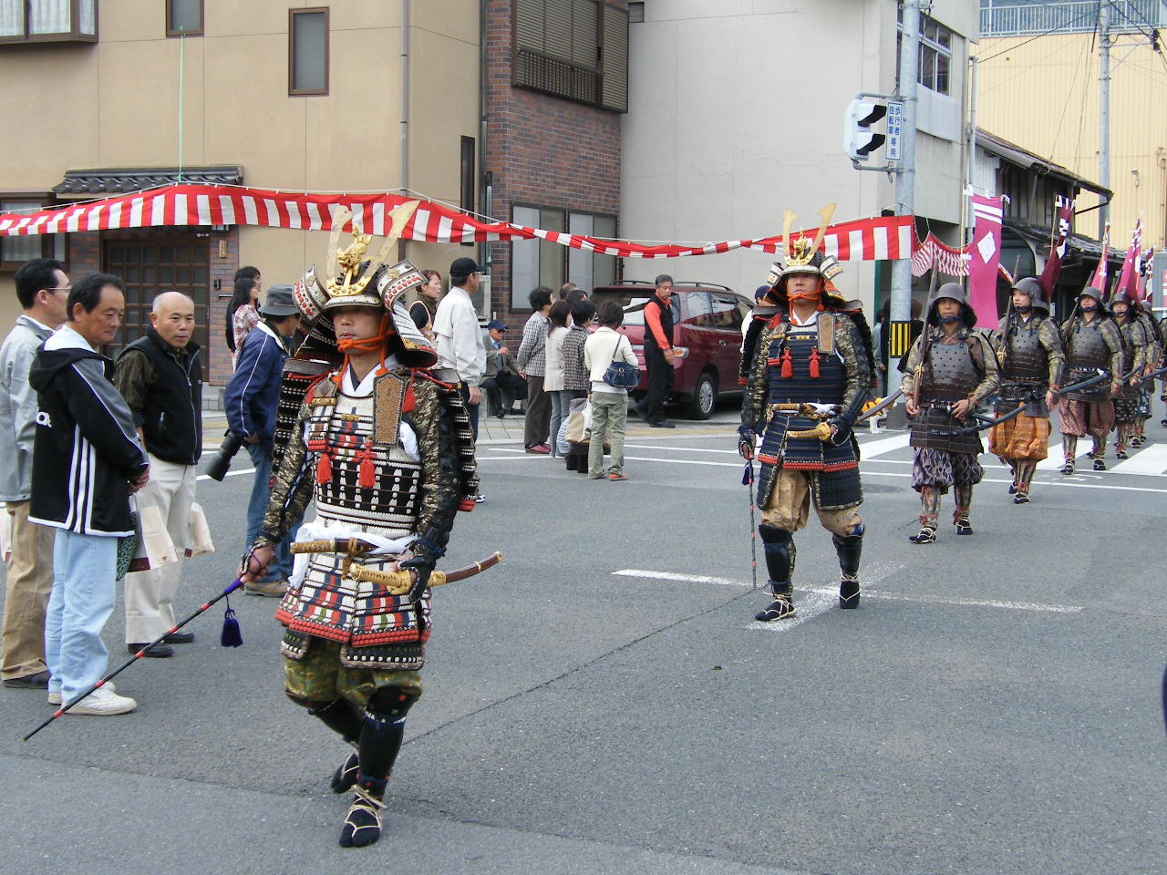 武者行列には、町内各企業や事業所から多くの若者が参加し、鎧甲に身を包んで、法螺貝の音を聞きながら銅鑼と太鼓の音に合わせて行進していきます。