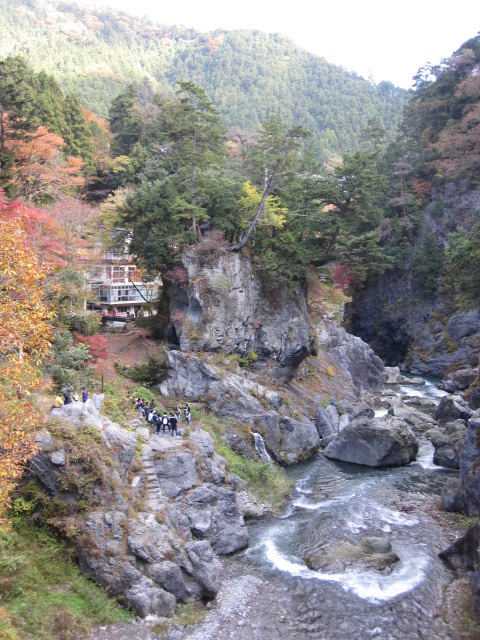 鳩ノ巣駅から対岸に渡り、渓谷越しに鳩ノ巣荘を展望する。御岳渓谷の見どころの一つ。