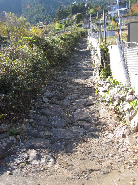 白丸集落内に残る石畳を辿り、地元の人から話を聞く。
