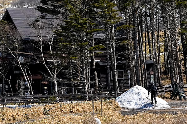 | 3月初めのヒュッテの光景。今年は例年より積雪が少なく、草原はすっかり斑雪(はだらゆき)。落葉松の霧氷に代わって、小屋の前には背丈ほどの雪の小山。お客さんが登って遊んでいました。 |