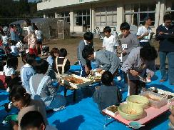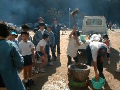 収穫祭(行政区ごとに分かれ、保護者といっしょにもちつきを行いました。おいしいおもちをみんなお腹いっぱい食べました。もちつきの前に、1・3・5年生が、体育館で収穫の喜びに感謝する発表を行いました。)