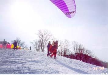 ※木島平のランディングは雪景色のため高度感覚が鈍り、また、フォロー気味の吹き下ろしの風の場合が多く、ショートしてしまった人をたくさん見かけました。丹那でのランディングでアゲインストで降りる場合より沈下率が大きくなるので随分高めに進入する事が必要です。また、ランディング直前のアプローチでランディングに背を向けるターンは禁物です。